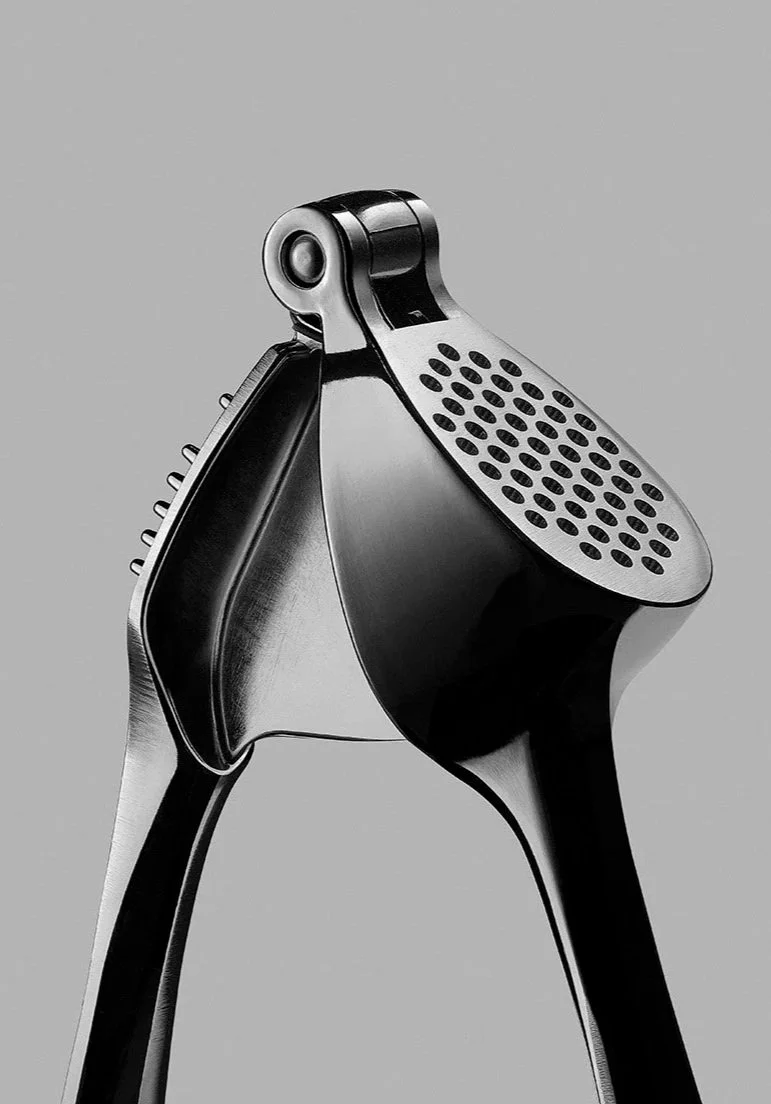 Revell frames it to emphasise its powerful, levered mechanics and the utilitarian beauty of its pierced metal basket. It represents the joy of a tool that performs one job perfectly. There are very differing opinions on the flavour of garlic once pushed through a press.